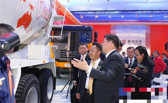 此次參展的混凝土攪拌車上裝是中集凌宇的暢銷產品,美觀大方的罐體結合聯合卡車高端底盤,成為展廳一大亮點。上圖為中集集團總裁麥伯良饒有興致參觀這臺攪拌車,中集凌宇副總經理胡柏林向麥總介紹凌宇上裝。